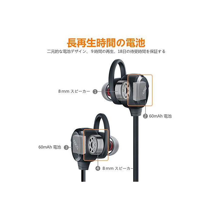 【우수한 전지 용량】120mAh초 대용량의 중합체 전지에서,또한 Bluetooth 4.1이 붙고 있고, 대기시에는 압도적인 저 소비전력에,450시간의 스텐바이 상태를 실현.1회 불과 2시간의 충전으로,연속 9시간의 음악 재생이 가능합니다.