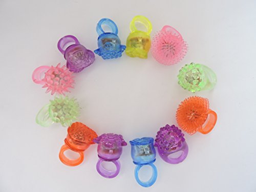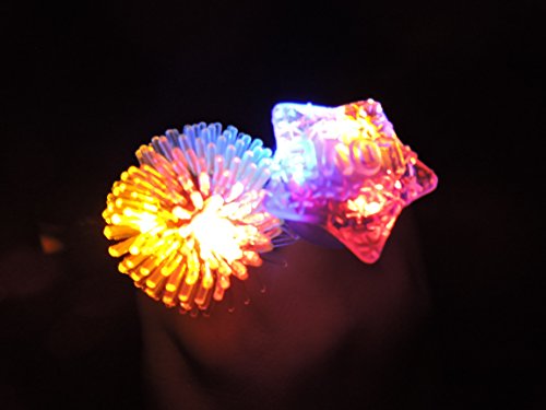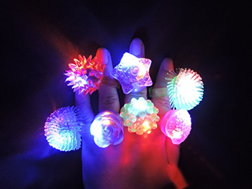 - Feature : LED jelly rings are great accessories for all celebrations, parties, and occasions / Flashing Mode: The LED lights inside the rings flash red, green, and blue;There are 6 designs (rose, strawberry, star, koosh ball, spike,heart-shaped)and each ring is a different solid color (blue, green, orange, pink or purple NOTE: RANDOM COLOR. we will be random delivery! Hope undertand) / ON/OFF Switch: On the back/inside of each ring is a small button that can be seen and felt through the rubber, this enables the lights to be turned on and off / Material: The rings were made of soft streachy rubber, in which the LEDs are encased. This stretchy material makes it possible for most people to wear the ring on any finger;great fun for all ages / Powered by batteries: 3 pieces AG10 batteries included;Over 12 Hours non stop operating time and much longer when used with breaks