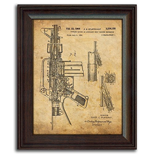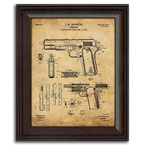This set of 3 framed prints features the patents for a Browning 1911, M-16, and a Bolt Gun. Based on the actual drawings of patents filed in the US, these modern prints are set against a vintage paper background and paired with other themed prints! These prints are a perfect fit for any décor. Each of the prints is finished behind glass in a 14"x17" contoured polystyrene frame with a realistic wood grain finish.Feature