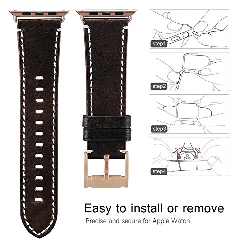 -. Feature : Applicable Type and Size: This band is fit for Apple Watch +, Series 2, Series 1, Series 3, Sport Edition. It has 2 versions, 38mm and 42 mm. Make sure you choose the right version. And band for 38mm watch is shorter than 42mm's. Band for 38mm watch fits 6.8-8.4 inches (175mm-215mm) wrist. Band for 42mm watch fits 6.8-8.8 inches (175mm-225mm) wrist. / Superior Quality and Good Craftsmanship: The band is made of 100% genuine cowhide leather. The buckle and adapters are rose gold, which upgrades the outlook of your apple watch. And the screws are tightly screwed in. The edges of the band is sewn with tiny, exquisite stitching. The interior of the band is surP.R.Isingly breathable, which helps keep your wrists cool and minimize sweat. / Excellent Choice: This band is a fashionable choice for many occasions such as:casual events like BBQ; eating out or to the bars; a business casual setting like the office; dressing up for formal events. It makes you stand out in the crowed with its fabulous appearence and good craftsmanship. / Discoloration Problem: There might be an area of discoloration where the buckle secures the watch, this is often the case with leather product. It is in no way visible when the watch is worn / After-sales Service: 180 days warranty. Hassle-free customer service: if there are any quality problems, just contact us. We would refund you or sent you a brand new one with 180-day warranty.