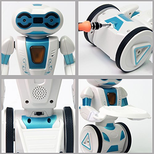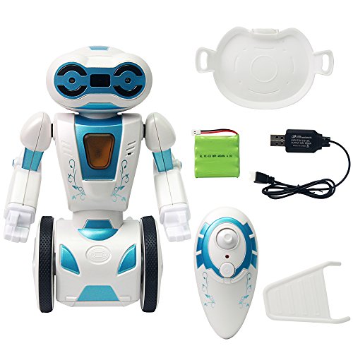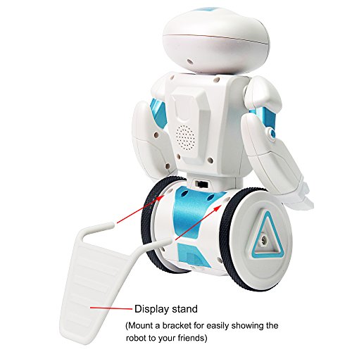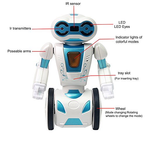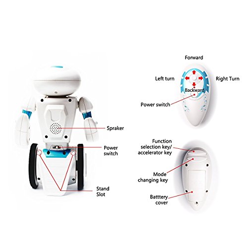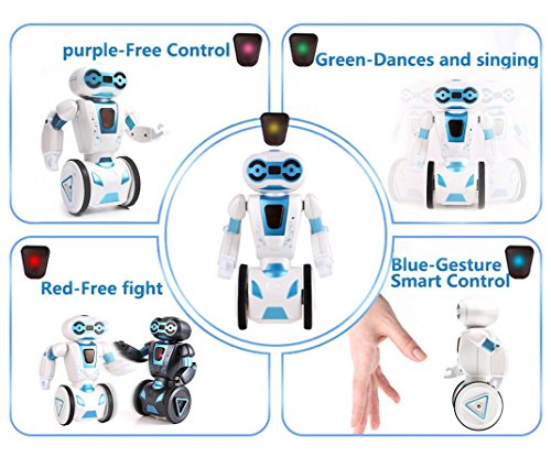 Wisamic smart self-balancing robot is equipped with a strong 2.4Ghz transmitter, more than 65 feet controllable distance. It features with 5 real lifelike operating modes: Dancing, Boxing, Driving, Loading and Gesture. Its hands could 360°rotate. It could also produce vivid and different sounds under different modes. This robot can communicate through Motion, Sounds, and RGB LED Lights.