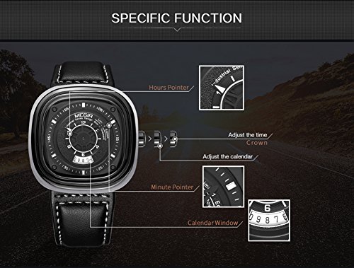 -. Binding : Watch -. Brand : MEGIR -. Department : Mens -. Feature : High Quality Quartz Movement: precise quartz movement for accurate time keeping. / Water resistant to 99 feet (30 M): Not suitable for swimming, diving, shower etc. / Built-in battery can be maintained for 2 years. / Enhance the hardness and wear resistance of glass. / Luminous Hands: glow after absorbing light. -. Label : MEGIR -. Manufacturer : MEGIR -. MPN : MR2027 -. PartNumber : MR2027 -. ProductGroup : Watch -. ProductTypeName : WATCH -. Publisher : MEGIR -. Studio : MEGIR -. Title : MEGIR Men's Genuine Leather Band Watch Chronograph Calendar Date Waterproof Square Business Quartz Wristwatch