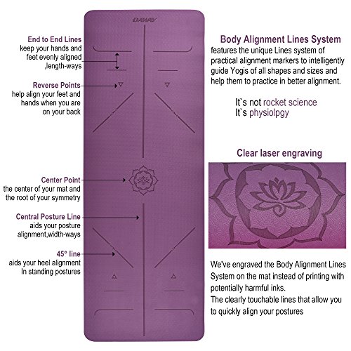 Eco Friendly TPE Yoga Mat - DAWAY Y8 Wide Thick Workout Exercise Mat, Non Slip Hot Pilates Mats, Body Alignment System,Tear Resistant, with Carrying Strap, 72"x 26" Thickness 6mm, 1 Year Warranty