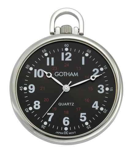-. Binding : Watch -. Brand : Gotham -. Department : Mens -. Feature : Classic open face silver-tone men's pocket watch with ultra thin polished brass case suitable for engraving / Black railroad style dial with white 12 and red 24 hour markers / Precision Japanese analog quartz movement / Includes matching 14" curb pocket watch chain with sP.R.Ing ring attachment / Arrives with deluxe draw string pouch and gift box, operating instructions and lifetime limited warranty card -. Label : Gotham -. Manufacturer : Gotham -. Model : GWC15027SBKA -. MPN : GWC15027SBKA -. PackageQuantity : 1 -. PartNumber : GWC15027SBKA -. ProductGroup : Watch -. ProductTypeName : WATCH -. Publisher : Gotham -. Studio : Gotham -. Title : Gotham Men's Silver-Tone Ultra Thin Railroad Open Face Quartz Pocket Watch # GWC15027SBKA