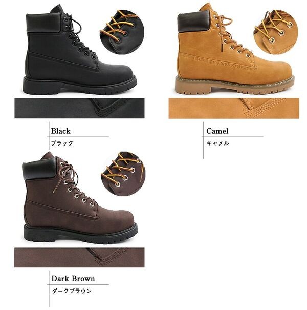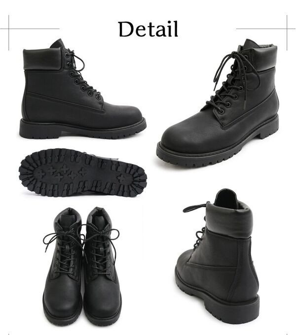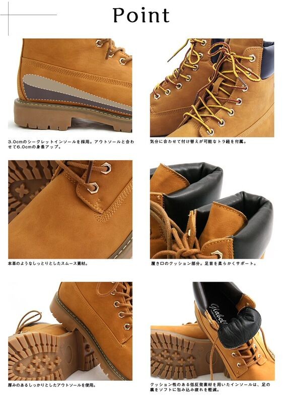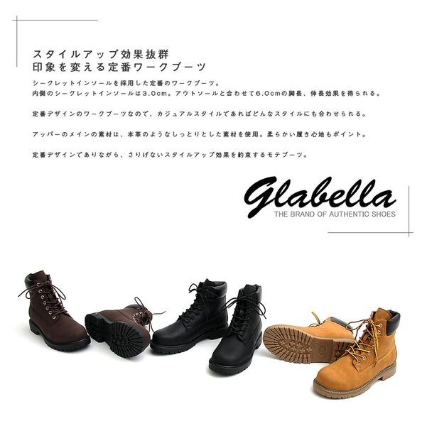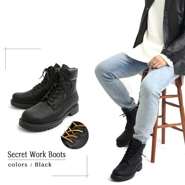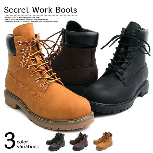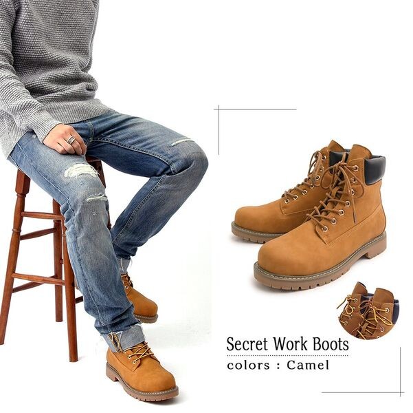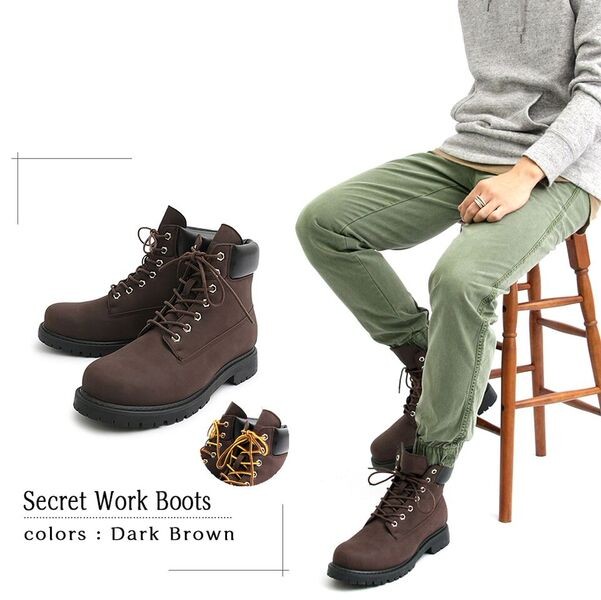 スタイルアップ効果抜群印象を変える定番ワークブーツ シークレットインソールを採用した定番のワークブーツ。内側のシークレットインソールは3.0cm。 アウトソールと合わせて6.0cmの脚長、身長効果を得られる。 定番デザインのワークブーツなので、カジュアルスタイルであればどんなスタイルにも合わせられる。 アッパーのメインの素材は、本革のようなしっとりとした素材を使用。柔らかい履き心地もポイント。 定番デザインでありながら、さりげないスタイルアップ効果を約束するモテブーツ。