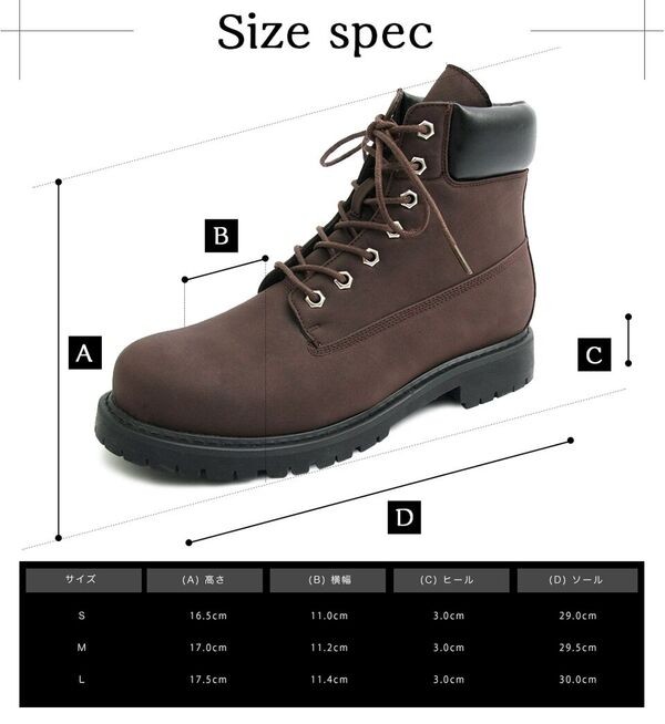 ■商品説明 スタイルアップ効果抜群印象を変える定番ワークブーツ シークレットインソールを採用した定番のワークブーツ。内側のシークレットインソールは3.0cm。 アウトソールと合わせて6.0cmの脚長、身長効果を得られる。 定番デザインのワークブーツなので、カジュアルスタイルであればどんなスタイルにも合わせられる。 アッパーのメインの素材は、本革のようなしっとりとした素材を使用。柔らかい履き心地もポイント。 定番デザインでありながら、さりげないスタイルアップ効果を約束するモテブーツ。 ■サイズ Sサイズ (25.0cm~25.5cm) Mサイズ (26.0cm~26.5cm) Lサイズ (27.0cm~27.5cm) ■素材 │アッパー素材:合成皮革│アウトソール素材:合成ソール