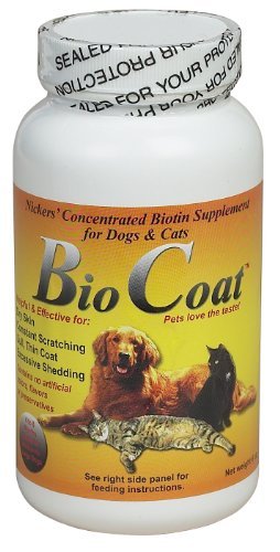 -. Feature : Helpful & effective for: dry skin, constant scratching, dull thin coat, excessive shedding. / Contains biotin and essential fatty acids plus a wide spectrum of vitamins and minerals. / Contains no artificial flavors, colors or preservatives. / Each scoop contains 1.5 mg (1500 mcg) of Biotin. Feed 1/4 teaspoon (scoop provided) per 30 lbs of weight. / 2 to 4 months supply for dogs 30-90 lbs and 4 months supply for all cats.