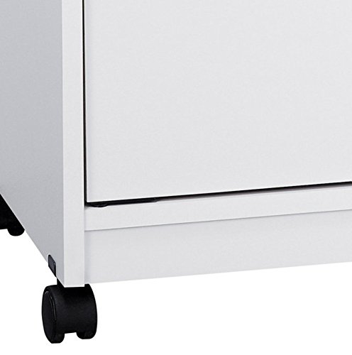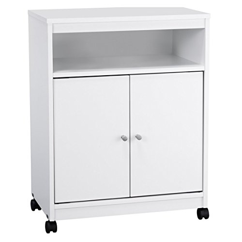 - Feature : Maximize kitchen space with extra storage and a shelf for the microwave / A white stipple finish with brushed nickel knobs lets the cart blend in any decor / Ample storage space behind two lower doors; easy rolling casters for mobility / Easy assembly required with basic household tools; limited one-year warranty / Measures 23.63 inches wide by 14.69 inches deep by 30.31 inches high; weighs 38 pounds