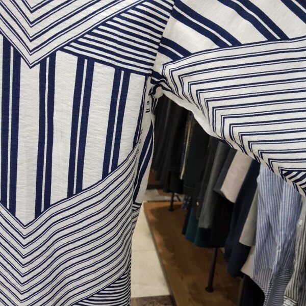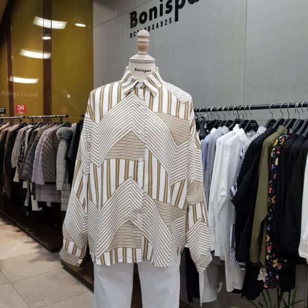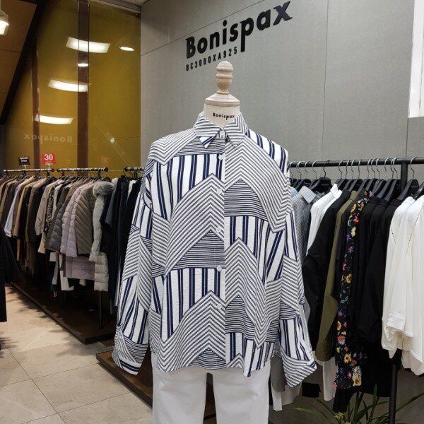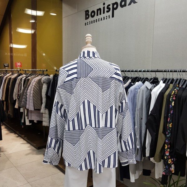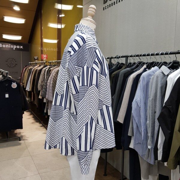 앞뒤 기장이 언발란스한 박시핏 셔츠에요~~평범한 스트라이프 디자인이 아닌 유니크하지만 화려하지 않은 디자인이에요~!
