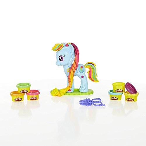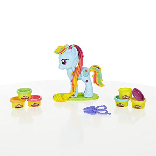 What’s more fun than a magical, fashionable pony? A pony you can “grow” hair for! This Rainbow Dash Style Salon playset includes a pony extruder that looks like Rainbow Dash and 6 colors of Play-Doh modeling compound. You can make a rainbow braid for her and cut it off with the scissors, and make all kinds of fun decorations for her! When you’ve got the Rainbow Dash Style Salon playset, the only limit to the creativity is your imagination!Feature