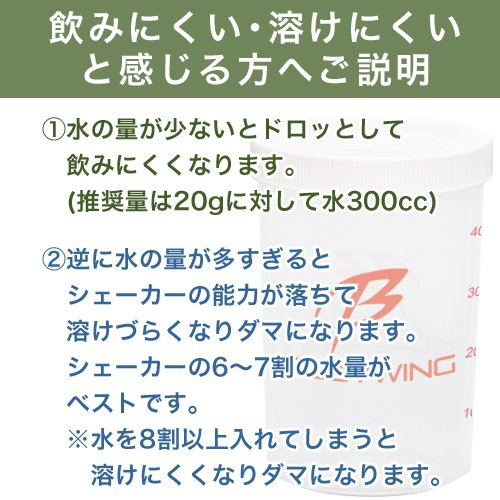 ・水やジュースに溶かして飲む場合、市販のプロテインシェーカーをご使用いただくと溶けやすくなります。
