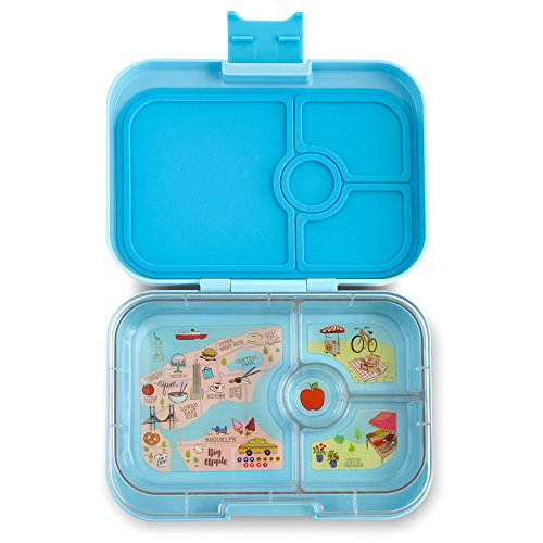 Perfect for kids and adults! 4 compartments (total volume 3 cups plus dip): One 2 cup portion for sandwich/salads, Two 1/2 cup sides, One 1 oz dip/treat well. Illustrated "NYC" Tray.