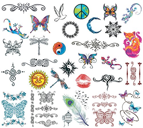 ? Feel radiant? Wear the Sun face ? Feel Responsible? Wear the Peace on earth ? Sexy? Lipstick lips, Glitter fox ? Mysterious? Henna in 3 colors ? Transformative? Butterflies ? Beautiful? Flower vines, Peacock feather ? Free? Dove, Flock of birds ? Loving? Swirls w/ heart ? Outdoorsy? Colorful, stylized Geckos, Dragonfly ? Strong? Powerful black Tribal sun, Tribal flower ? Spiritual? Yin-yang, Blue moon *Occasionally we have to substitute one or more of the designs for production reasons but we will always give you at least 43, and all fabulous!*