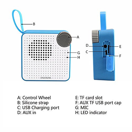 Studio : Yinuo Digital Publisher : Yinuo Digital Binding : Electronics Product Description Do you always have trouble climbing or cycling without enough portable outdoor speakers? Do you often miss important calls while Outdoor exercise? You need an?ENUOSUMA Portable Bluetooth Speaker ?to help you out of all above trouble. ENUOSUMA,professional Bluetooth Speaker designer and manufacturer.We have our own factory,provide best quality device to our customer.Add to cart,you will get 18 months Guarantee. ?Palm Size, Perfect for Outdoor -2.8 Inches long ,2.8 inches high and 1.2 inches wide.Amazingly light Just 6.1 ounces. ?-Silicone strap and outdoor aluminum alloy metal hook offer you convenience to hang and attach it to anywhere you want. ??Free Your Hands? No matter enjoy indoor or outdoors time, the hands-free function allows you to enjoy wonderful music at the same time not miss any call,very intimate design. ?Easy to Use? -Connect in just a few seconds over Bluetooth to your iPhone, Smart-phone, and Tablet.? -Play from Chrome-books,TVs and non-Bluetooth devices using the included 20 inches audio cable connected to AUX-IN jack.? Specification: 1.Charging voltage/current:5V/1A 2.Battery:Built-in Lithium battery,3.7V 500mAh 3.Speaker:3W *1 4.Bluetooth Version:V4.1 5.Charging time:3-4 hours 6.Play time:6 hours 7.BLuetooth working range:33 foot Package: -1 x Mini Speaker--Blue -1x Aluminum Alloy Metal Hook -1 x 14 Inches USB Charge Cable -1 x 20 Inches AUX Audio Cable -1 x User Manual 0