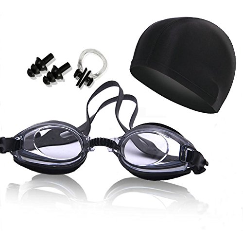 Swimming Goggles ,Triathlon Glasses Anti Fog Shatterproof UV Protection, Swim Glasses with Silicone Swim Cap, Earplugs, Nose Clips for Men Women Adult Youth Kids Child, Black