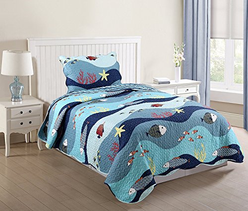 Studio : ocean home fation Publisher : ocean home fation Product Description Let the kid in you come out and dive into the magic world of sea life surrounded with fish, reefs, and colorful ocean floor. Face of the comforter adds fun to the decor with its print details while reverse of the comforter adds serenity with wave pattern in the shades of blue and white. This set is soft to the hand and has wonderful quilting details. Quilt Set Measurements: King Set: Quilt - 102" x 86", 2 Shams - 20" x 36" Queen/Full Set: Quilt - 84" x 86", 2 Shams - 20" x 30" Twin Set: Quilt - 68" x 86", 1 Sham - 20" x 30" Package Include: 1* quilt 68"x 86" 1* pillow sham 20"x 26" 0