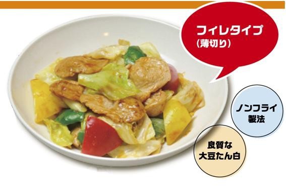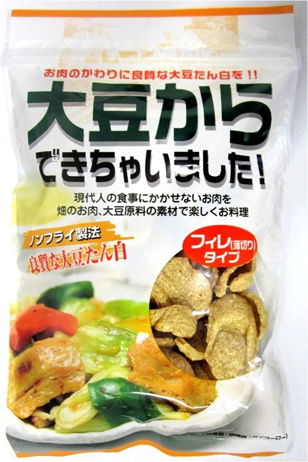 | 大豆たんぱくを加工し、フィレ(薄切り)状にしました。水戻しするとお肉のような食感になります。野菜と一緒に炒めたり、味付けしてそのまま焼いたりと使い勝手がよく、いろいろな料理にご利用頂けます。植物性たんぱくを上手に摂取し、健康的な生活を。 |