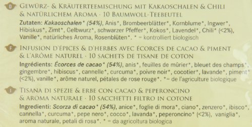 -. Binding : Lebensmittel & Getränke -. Brand : Hari Tea -. EAN : 8717853491160 -. Feature : Unsere Zutaten stammen zu 100 % aus kontrolliert biologischem Anbau / Rückstandskontrollierte Baumwoll Teebeutel, edel und geschmacksneutral / Einzigartige Kräuter- und Gewürzkombinationen / Tee wird per Hand in einer Fair-Trade-zertifizierten Manufaktur abgefüllt / Durch den Grobschnitt bleiben ätherische Öle und die vollen Aromen erhalten -. Label : Hari Tea -. Manufacturer : Hari Tea -. Model : 436507 -. MPN : 436507 -. NumberOfItems : 2 -. PackageQuantity : 2 -. PartNumber : 436507 -. ProductGroup : Grocery -. ProductTypeName : GROCERY -. Publisher : Hari Tea -. Studio : Hari Tea -. Title : Hari Tea Für die Liebe / Verführen ist menschlich Schoko & Chili, 2er Pack (2 x 20 g) - Bio