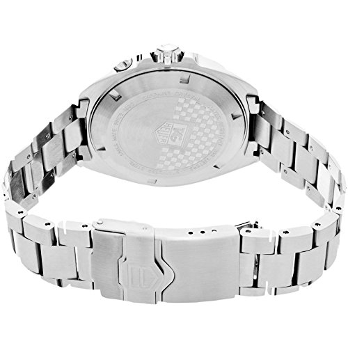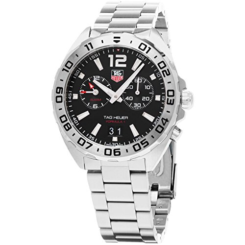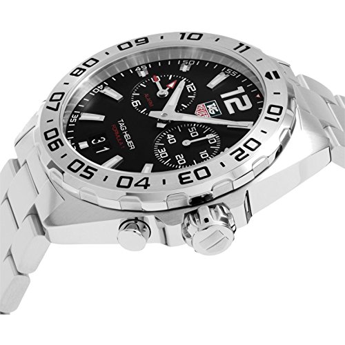 Brushed and polished stainless steel case (41 mm in diameter, 12 mm thick), Screw-down case-back with special checkered decoration, Stainless steel bezel engraved with black Arabic numerals, Black dial with Tag Heuer logo at the 12 o'clock position, Silver-tone luminescent hands, indices and Arabic numeral, Small seconds sub-dial at the 3 o'clock position, Double date window at the 6 o'clock position, Alarm time displayed in the sub-dial at the 9 o'clock position, Screw-down crown, Scratch resistant sapphire crystal, Swiss quartz movement, Water resistant to 20 ATM/200 meters/660 feet, Brushed stainless steel bracelet with diver's or racing suit extension, Deployment clasp with safety, Model number: WAZ111A.BA0875.Feature