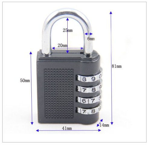 -. Feature : 4-dial combination lock design for increasing the security, each lock can be set to your own combination code. / With a steel shackle, strong and durable. / Combination code can be reset as often as you want, with up to 10000 different combinations. / It can be used for lockers, lage, toolboxes, etc.