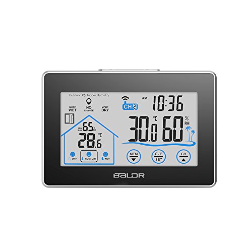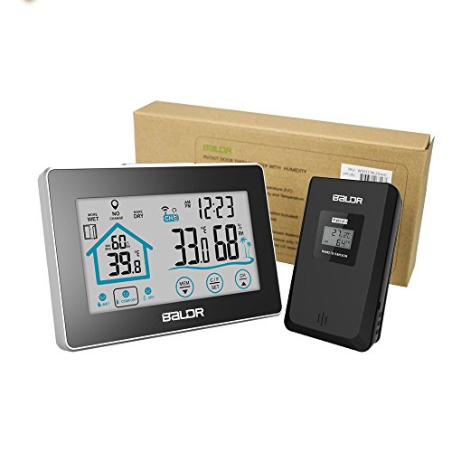 -. Brand : BALDR -. Color : Black with Silver -. EAN : 0614134699018 -. Feature : Detailed Metrics: Screen displays time and a temperature and humidity section, which shows indoor and outdoor temperature and humidity. Device records minimum and maximum indoor and outdoor humidity and temperature,(There are two setup modes for max/min record: auto clear and re-start record at 0:00; or the record last all the time from power on.) and displays weather comfort level status. / Simple Navigation: Three touch screen buttons allow you to setup the display and quickly check minimum and maximum temperature and humidity. / Accurate Readings: A wireless remote sensor is included to detect the outdoor temperature and humidity. / Easy to Read: White backlight keeps device lit for a few seconds, making it easy for nighttime use. / Portable: Main unit is powered by 3 AAA batteries and sensor is powered by 2 AAA (each sold separately). -. Label : BALDR -. Manufacturer : BALDR -. MPN : B0317-Ⅱ -. PartNumber : B0317-Ⅱ -. ProductGroup : Lawn & Patio -. ProductTypeName : HOME_FURNITURE_AND_DECOR -. Publisher : BALDR -. Studio : BALDR -. Title : New Style BALDR LCD Touch Screen Weather Station Displays Temperature and Humidity Outdoor Sensor Included White Backlight -. UPC : 614134699018