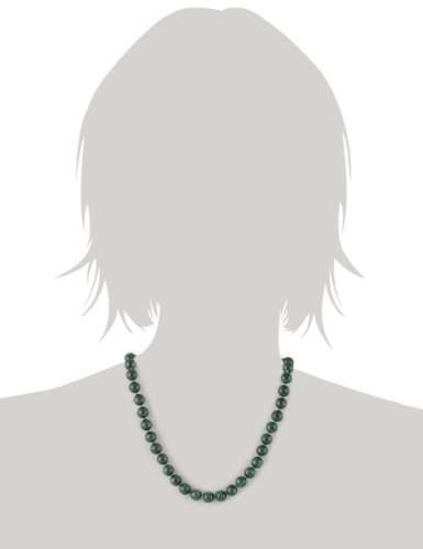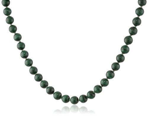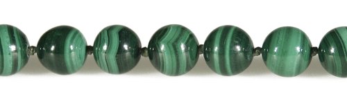 Malachite beads display their striking color--deep green with a banded light green pattern--in this elegant beaded necklace. The 17-inch strand holds 49 polished rounds (8mm) of malachite and fastens with a 14 karat yellow gold lobster claw clasp. To maintain the beauty of these distinctive beads, clean them gently with a soft cloth and avoid solvents.