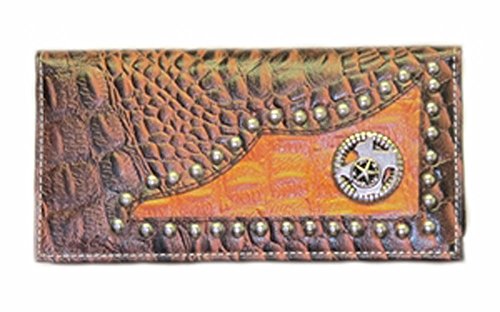 -. Feature : 7" Wide / Genuine Brown/Tan Leather with Lizard Skin Pattern / Silver Texas Concho & Decorative Silver Studs / Brown Leather Interior with Space for Checkbook, currency, credit cards & ID