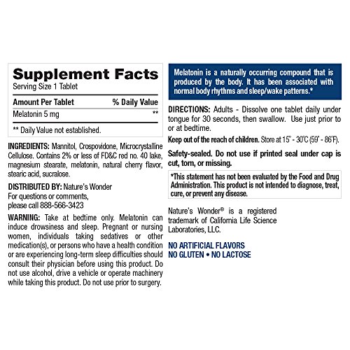 Product DescriptionNature's Wonder Melatonin 5mg Quick Dissolve Cherry Flavor. Helps support healthy sleep patterns.0