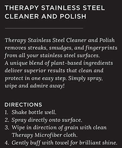 Studio : Therapy Publisher : Therapy Product Description New value pack! This listing is for (2) 16 oz. bottles of Therapy Stainless Steel Cleaner Polish. Microfiber towel not included. Spray, Wipe and Admire Away! Therapy Stainless Steel Cleaner Polish removes streaks, smudges, and fingerprints from all your stainless steel surfaces. A unique blend of plant-based ingredients deliver superior results that clean and protect in one easy step. Simply spray, wipe and admire away! Features Benefits ? Safe for all stainless refrigerators, stoves, microwaves, and other appliances ? Leaves a coconut-based protective shine ? Repels fingerprints, dirt, and dust. ? Includes (2) 16 oz. bottles of Therapy Stainless Steel Cleaner Polish Directions: 1. Shake bottle well. 2. Spray directly onto surface. 3. Wipe in direction of grain with clean Therapy Microfiber Towel. 4. Gently buff with towel for brilliant shine. Ingredients: Filtered water, coconut oil, sorbitan monooleate, lavender vanilla essential oil blend, acrylates copolymer, methylisothizolinone. 0