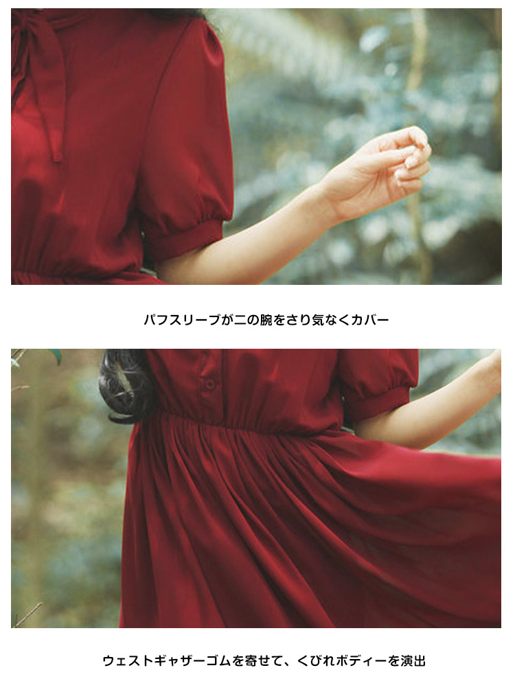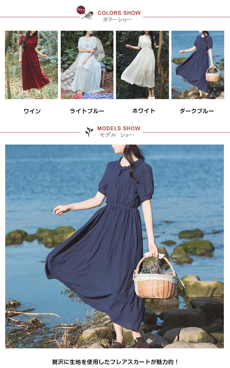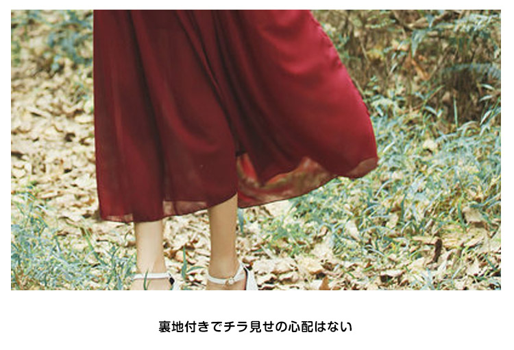 | 贅沢に生地を使用したフレアスカートが魅力的!空気をはらみ揺らめく無地シフォン素材が爽やかな雰囲気を醸し出すます。ストンと落ち感が自然なドレーブを生み出し、大人女性の譲れない存在!ウェストギャザーでキュット締め付けられて、女らしいシルエットを演出してくれます。 | |