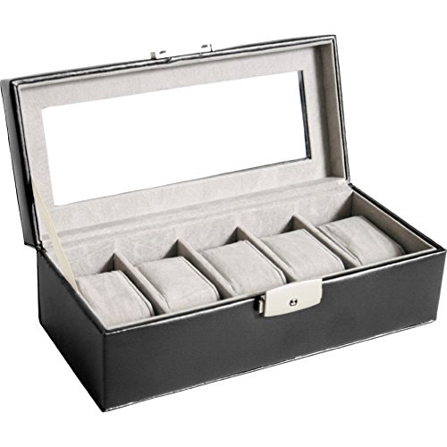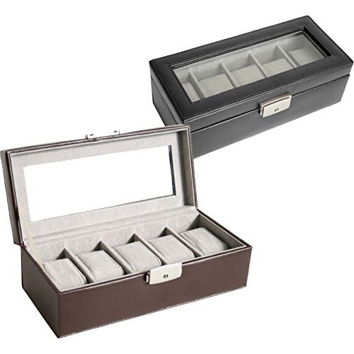 Studio : Royce Leather Publisher : Royce Leather Binding : Apparel Product Description Royce 5-Slot Leather Watch Box. Our leather watch box is the ideal way to showcase your collection. Put this elegant leather watch box on your dresser, nightstand, desk, bookcase, or anywhere else you want to display your watches. The smooth lines and minimal hardware complement traditional furnishings and modern decor alike. So, no matter where you put it, you can be certain your collection will look great. Large view-through lid lets our watch box double as a display case. If you're currently storing your collection in a drawer, you're not enjoying your watches like you should. This watch box protects your valuable timepieces and keeps them dust-free without hiding them away. Holds up to 5 men's watches. Box is finished with a genuine leather and velvet interior. You take pride in your collection, Show it off with a leather watch box from Brookstone. Order today! A Personalized Leather Watch Box is also available. Available in Black or Brown. Watchbox is 10" x 4" x 3". The perfect presentation for a gift on any occasion All Royce small leather products deliver in an upscale 2-piece dark blue gift box, thick silver elastic ribbon with bow, dark blue tissue paper, and an embossed silver sticker. At no additional cost! 0