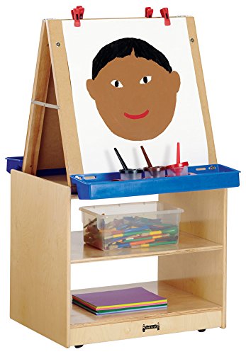 Studio : Jonti-Craft Publisher : Jonti-Craft Binding : Misc. Product Description Ample storage space below and between removable tabletop easels. Comes standard with hardboard easels. Optional Acrylic, Chalkboard and Write-n-Wipe panel available. Clips and paint trays are included. 0