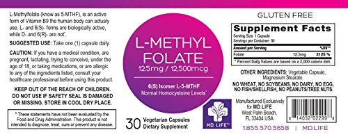 Optimized Folate (L-Methylfolate), 12500 mcg, 30 vegetarian tablets. Folate is involved in neurotransmitter synthesis and critical enzymatic reactions throughout the body. By depleting excess homocysteine, folate benefits cardiovascular health and nervous system function. Those who take ordinary folic acid supplements, however, may not be experiencing its full spectrum of effects. This is because once ingested, not everyone converts folate to its biologically active form called 5-methyltetrahydrofolate (5-MTHF). Research shows that in a large proportion of the population, genetic enzyme deficiencies prevent the conversion of folate to 5-MTHF, leaving many vulnerable to low blood folate levels (and higher than desired homocysteine). A more useful approach is to take the bioactive folate 5-MTHF directly, which has been declassified as a drug and is now available as a dietary supplement. 5-MTHF has been shown to dramatically raise blood serum folate levels compared with folic acid supplementation. This bioactive folate is up to seven times more bioavailable than folic acid. This greater bioavailability is especially important in people who have a genetic enzyme deficiency since it requires no conversion to become metabolically active.Feature