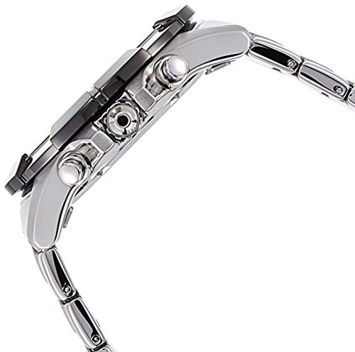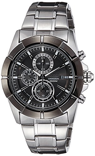 Stainless steel case with a stainless steel bracelet. Fixed bezel. Black dial with silver-tone hands and index hour markers. Minute markers around the outer rim. Dial Type: Analog. Luminescent hands and markers. Date display at the 3 o'clock position. Chronograph - three sub-dials displaying: 60 second, 60 minute and 1/10th of a second. Quartz movement. Scratch resistant Hardlex crystal. Pull / push crown. Solid case back. Case diameter: 45 mm. Case thickness: 12 mm. Round case shape. Band width: 24 mm. Fold over clasp with push button release. Water resistant at 100 meters / 330 feet. Functions: chronograph, date, hour, minute, second. Casual watch style. Seiko Lord Chronograph Black Dial Stainless Steel Mens Watch SNDE69.Feature
