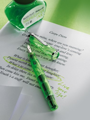 -. Feature : Dual purpose florescent green highlighter and fountain pen / Dual purpose pen comes with a bottle of green highlighter ink / Stainless Steel Double Broad Nib / Transparent green resin casing / This pen can be used with other inks