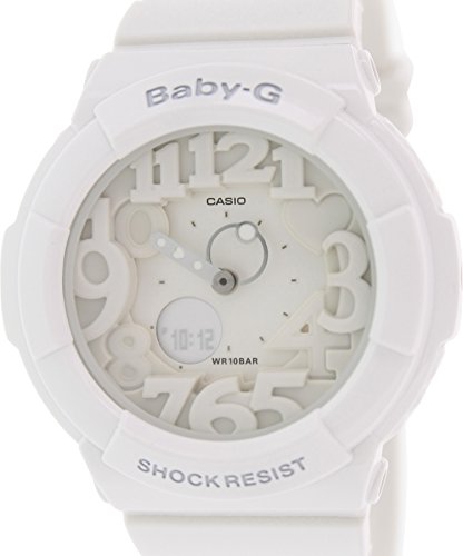 Casio - Baby-G - 3D Series - BGA131-7B - Here is a new collection of some of the coolest looking Baby-G models around. The numbers are designed to create a multi-dimensional effect that makes them look like they are stacked in multiple layers. Hearts add to the overall cuteness of the design. Press a button and a black light turns on, which decorates the face and hands with a splash of attractive color. The numerals, dial, and hands of the new BGA130/131 models are coated with a special fluorescent ink that becomes luminous under the watch's black light LED. All of this plus World Time and 100-meter water resistance make these watches as functional as they are cute. White resin band digital watch with white face. Shock Resistant - 100M Water Resistant - Ultraviolet LED Light with Afterglow - World Time: 29 time zones (27 cities), city code display, daylight saving on/off - 4 Daily Alarms and 1 snooze alarm - Hourly Time Signal - Countdown Timer - Full auto-calendar (pre-programmed until the year 2039) - 12/24 Hour Formats - Accuracy: +/-30 seconds per month - Battery: SR726W x 2 - Approx. Battery Life: 2 years - Module 5194 - Size of case/total weight: BGA131 43.4 x 43.1 x 15.0mm / 44gFeature
