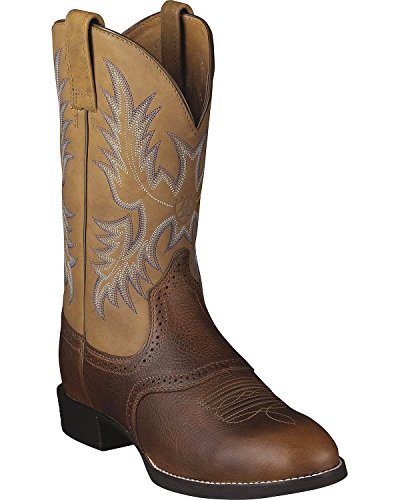 Studio : Ariat Publisher : Ariat Binding : Apparel Product Description Ariat Boots ATS technology supports and cushions as you move, promoting good posture and reducing fatiguefort technology is what we love about Men's Ariat Boots At the core of ATS technology is the Ariat ATS composite shank. This patented shank design reduces skeletal and muscular fatigue and injury. Mid-foot support reduces metatarsal stress. The forked shank design allows natural forefoot flex. The ATS footbed has a low-friction surface to protect from heat build-up and blistering. Shock-absorbing gel forefoot cushion reduces skeletal impact stress on knees, hips, and lower back. Cupped footbed chassis offers torsional stability. These Heritage Stockman cowboy boots feature a smooth chocolate brown leather foot with saddle vamp under a fancy stitched 11" tan leather shaft. 1. 375 roper heel. Single stitched welt. Leather lining. Easy-on pull straps and round toe profile. Imported. 0