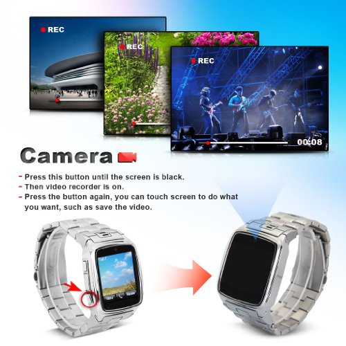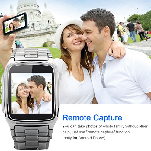 - Feature : Sync phonebook,incoming call, and music with Android devices or iPhone / Sync SMS with Android devices / Anti-lost Function: Alarm with sound or vibration if leaving your smartphone Beyond 10 meters / Camera: 1. Support camera; 2. Video Recording 3. Photo taking / Remote Notifier : When software on Android phone has some information, the smart watch will remind you. So you will never miss them even if in noisy party!