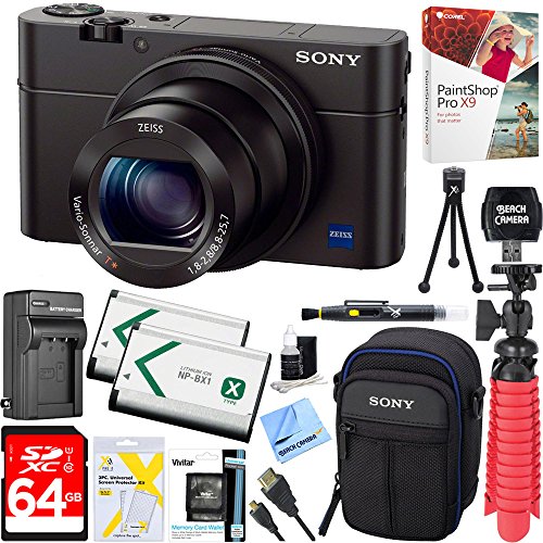BUNDLE INCLUDES: Soft Carrying Case for Cyber-shot Digital Cameras - 64GB Class 10 UHS-1 SDXC Memory Card - 2 x NP-BX1 Extra Battery Pack and Charger - Corel Paint Shop Pro X9 - 12-inch Rubberized Spider Tripod - LCD/Lens Cleaning Pen - SD Memory Card Reader - Tri-fold Memory Card Wallet - LCD Screen Protectors - Mini Tabletop Tripod - 3 Piece Lens Cleaning Kit - Beach Camera Microfiber Cleaning Cloth