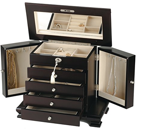 -. Brand : Seya -. Feature : Hand-crafted of solid wood with an elegant espresso finish / Interior is lined in a plush, cream colored velvet like material / Brushed nickel hardware that blend with any décor / 4 removable drawers with multiple organizational compartments / 12.5"L x 7"W x 11.5"H -. Label : Seya -. Manufacturer : Seya -. ProductGroup : Kitchen -. ProductTypeName : KITCHEN -. Publisher : Seya -. Studio : Seya -. Title : Seya Locking Wooden Jewelry Box Ring Storage Case Organizer