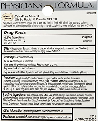 -. Title : Physicians Formula Mineral Wear Talc-Free Mineral Oh So Radiant! Powder SPF 20, Translucent, 0.35 Ounce