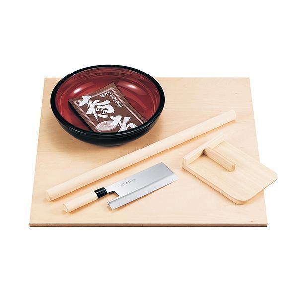 | サイズ | のし板:W60×D60×H1.5cm、こま板:W21×D15×H3cm、めん棒:φ3×60cm、こね鉢:φ31.5×H7.5cm、包丁:全長31cm、刃渡21.3cm 個装サイズ:61.5×61.5×13.5cm |