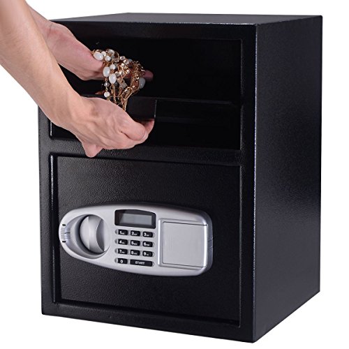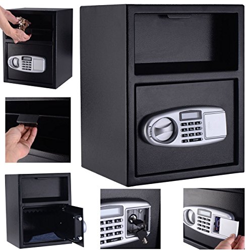 -. Feature : This Unit Can Keep Cash, Jewelry, Guns, Documents And Other Valuables Safe. / Digital Entry Eliminates The Need For Making Multiple Key Copies, Easy To Operate And Program, An Easy Access Deposit Slot Makes It Simple To Leave Deposits At The End Of The Day, Constructed With 3mm Thick Solid Steel Of Body, 6mm Thick Solid Of The Front Door For Security, Carpet Padding On Inside Bottom, 2 Pre-Drilled Holes In The Back Of The Box For Anchoring. / Anchor Bolts Are Included. Powder Coated Interior And Exterior. Runs On AA SIZE(1.5V) Batteries (Included). Opens With Secret PIN Code Or Included Keys (2 FREE KEYS). Mounting To The Wall Or Cabinet. / Color: Black, Material: Solid Steel, Operation: Digital PIN Or Override Key, Overall Dimension: 13.9"X11.9"X17.7"(LXWXH), Exterior Dimension:13.0"X10.8"X17.1"(LXWXH), Size Of Door:8.9"X7.7"(LXW), Thickness Of Front Door: 6mm, Size Of Slot:12.0"X6.0"(LXW), Thickness Of Box Body: 3mm, Battery Required: 4 X AA-Size 1.5V, Time Out Period: After 4 Attempts, Product Weight: 48.4lbs. / Package Include: 1 X Safe Box 4 X Screws 4 X Battery 2 X Keys 1 X Velvet Cushion 1 X Instruction.