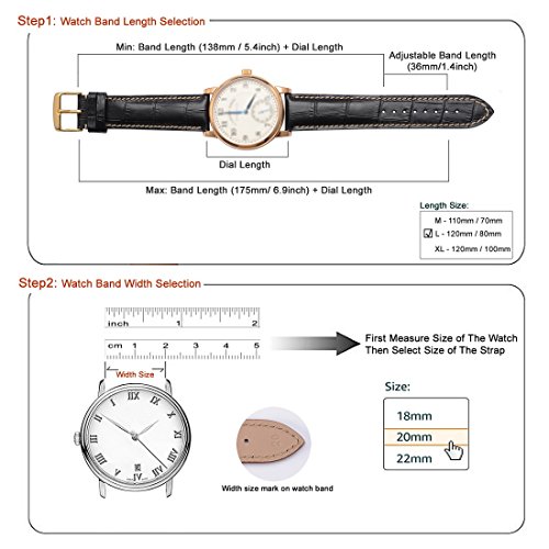 -. Feature : BAND MATERIAL: 100% genuine calfskin leather,watch belt surface use alligator embossed process matte effect, the strap perfect leather texture and edge hand lacquered,this bracelet with available in brown,black and blue with contrasting seam (sports-style) or tone on tone seam (classic-style),wristband stitching good quality particularly strong and durable and suitable for different styles of watches / LENGTH SELECTION: Band length 120mm (4.72inch) / 80mm (3.15inch)without buckle,the length of the strap is connected the shortest is 138mm ( 5.4inch),the longest is 175mm (6.9 inch) plus the size of dial length is equal to the total length. band adjustable length is 36mm(1.4 inch) hole distance of 5mm,before ordering please use the tape measure wrist circumference,replacemen watch bands / WIDTH SELECTION: WOCCI Watch Bands compatible with most traditional watches that uses 18mm,20mm,22mm sP.R.Ing bars, for example traditional watches for ,Omega,Citizen,Seiko,Casio,Blancpain,Hamilton,Panerai,Bell & Ross,Tag Heuer,Oris,Timex,Fossil,Tissot,,Ebel,Longines,Jaeger-LeCoultre,Piaget,Swiss Army etc., also compatible with most that uses 18mm,20mm,22mm sP.R.Ing bars smart watches for Huawei,Samsung Gear,Asus Zenwatch,Moto 360,LG Urbane,Please refer product description / USE AND MAINTENANCE: 1.easy to install,no tools required this replacement watch strap features a quick release strap that allows you to switch watchbands in one easy step with only your finger. simply slide the sP.R.Ing bar into place - no need for additional hardware.It fast and simple to install and change your band in seconds, 2.Wide 20mm,22mm strap thickness of 2.3mm / 5.0mm, the first use will be some stiff, after wearing the strap for a period of time will become soft / SERVICE GUARANTEE: We guarantee a 100% refund if you are not satisfied with the products you received within 30 days and we provide 12 month warranty, If anything is wrong - please feel free to contact us - we will make it right