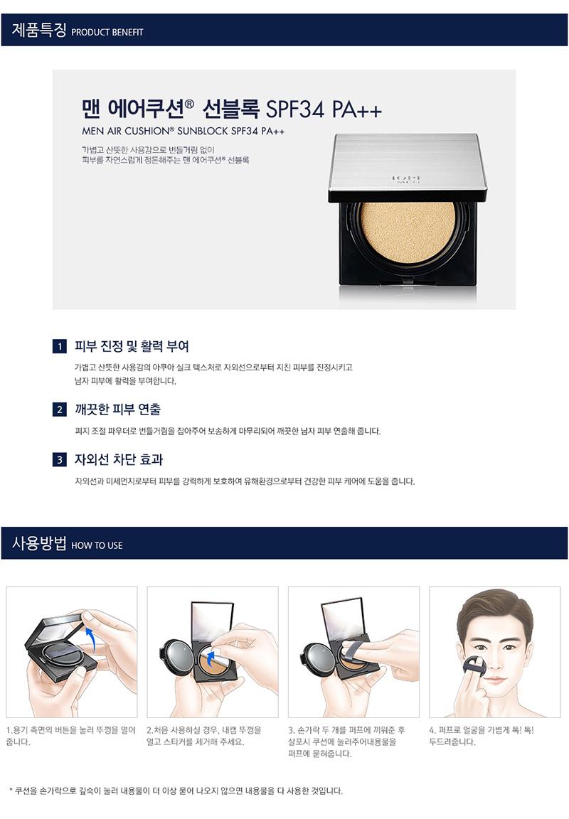 Men's air cushion sunblock that creates natural skin texture with light and fresh feelings