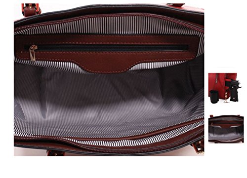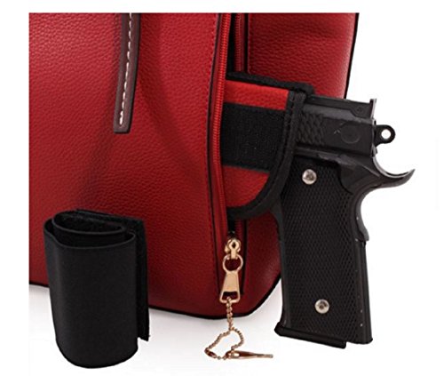 along with pockets for maximum organization and comes with a bonus matching wallet. Tote Dimensions: 12"L X 6"W X 11"H Concealed pocket measurement: 9.5"W X7"H Separately concealed compartment on back with 2-zipper openings for both right and left hand side carriers Lock and Key feature for safe and secure weapon storage Interior zipper pocket and two slip pockets Removable holster included Matching wallet included 8"L X 1"W X 3.5"H Made with Faux Leather