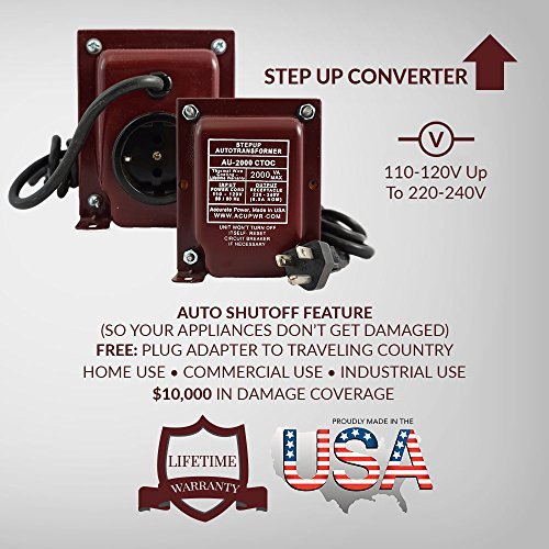 Our AU-2000 model is a 2000-watt, step up model that converts 110-120 volts to 220-240 volts. ACUPWR provides a lifetime warranty with up to $10,000 in damage coverage for this product.