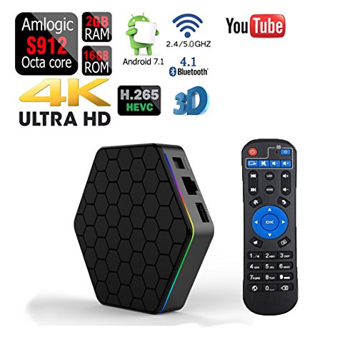 -. Feature : CPU: Amlogic S912 Octa-core 64 bit / GPU: Mali-450, up to 2 GHz Ultra high frequency, provides you with ultra-fast running speed and professional graphic processing ability / Android 7.1 Nougat OS System, KD 17.4 Version. Compatible with the vast majority of Android APP / 2GB DDR3 RAM and 16GB EMMC Flash. Support 1080p 4K 3D Resolution / 3D: Hardward 3D graphics acceleration. Expanded Storage: Supports TF Card up to 32GB / Dual WiFi: Built-in 2.4G/5G WiFi, Ethernet: 10M/100M, Bluetooth: V4.1