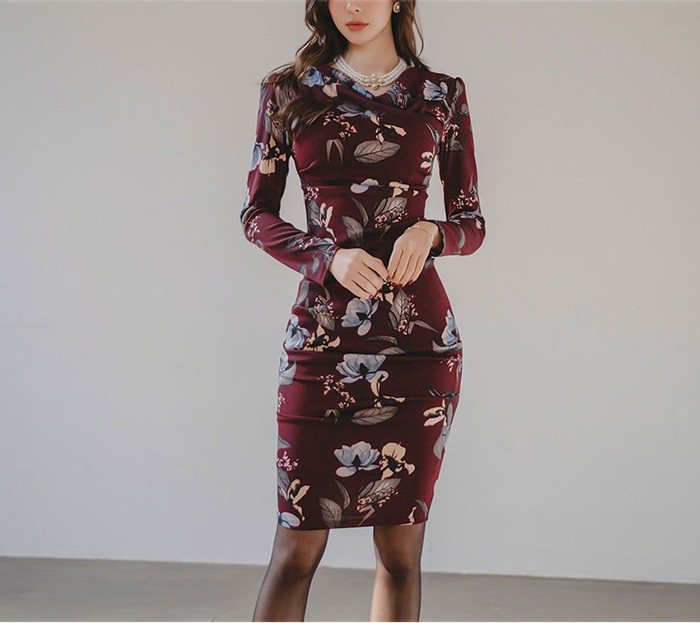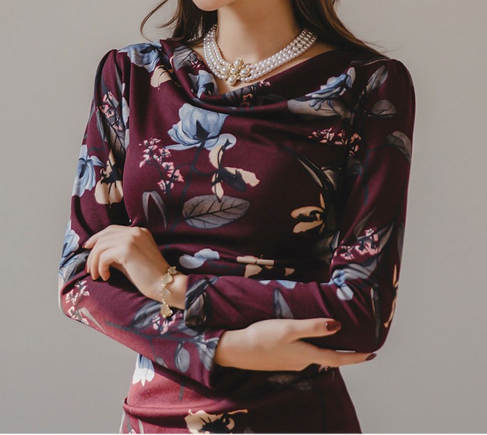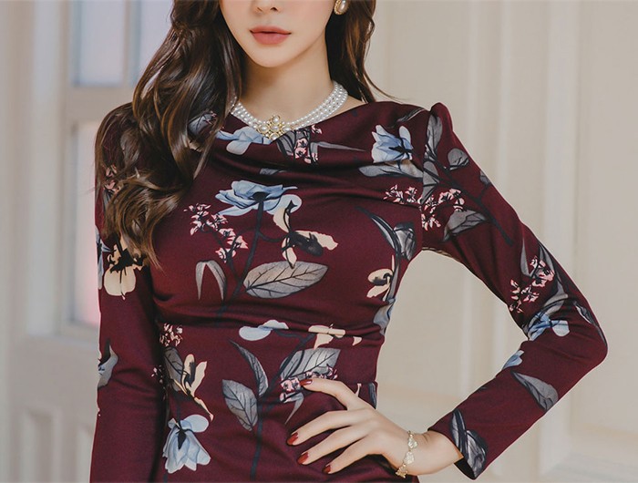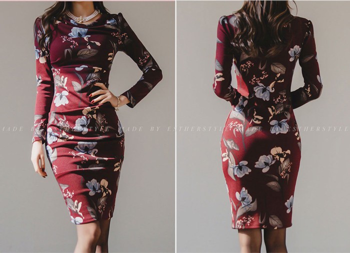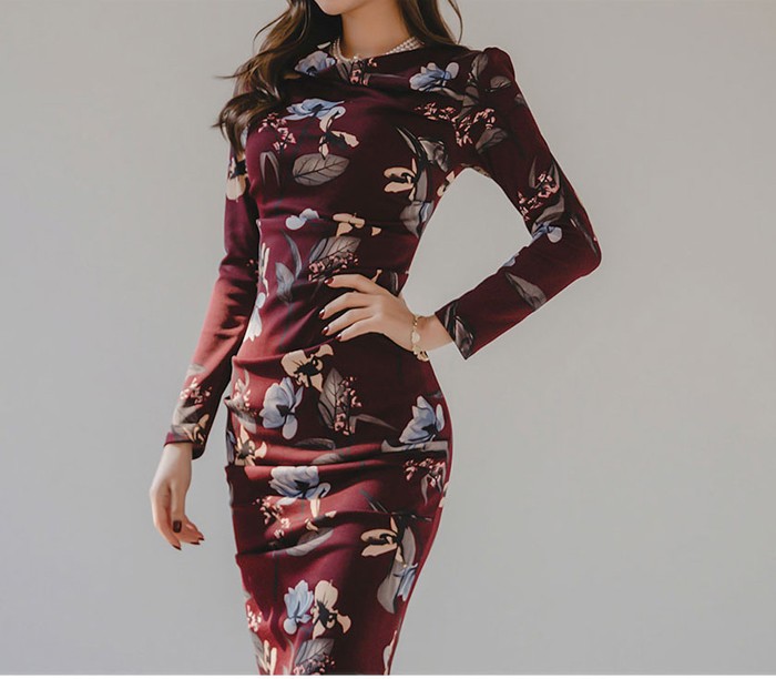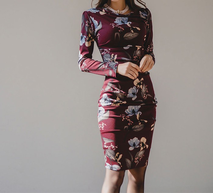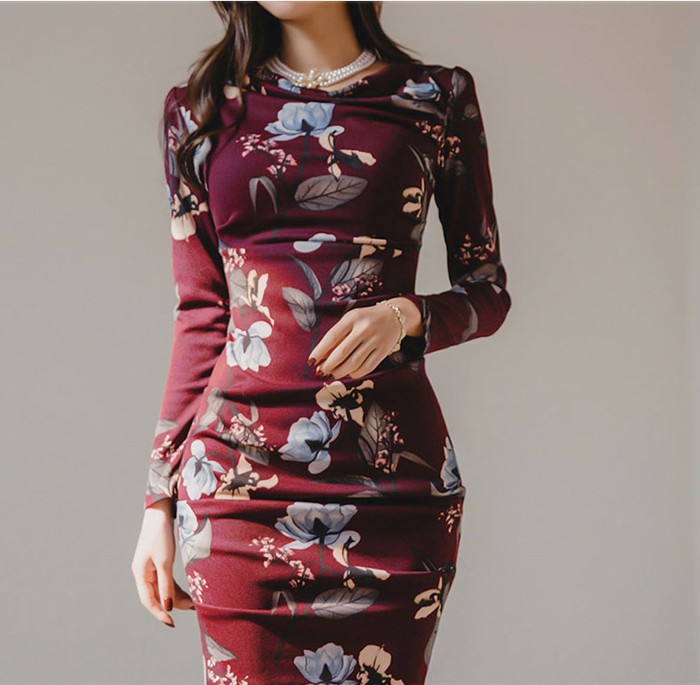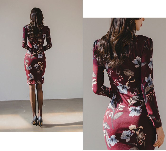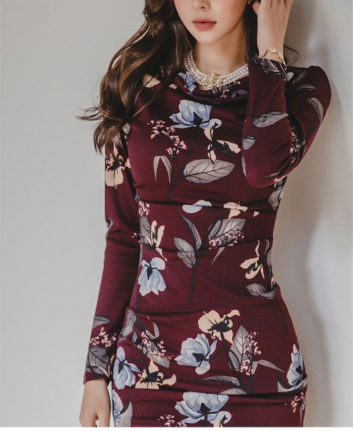 商品名:ワンピース タイトワンピース 膝丈 長袖 花柄 フラワー