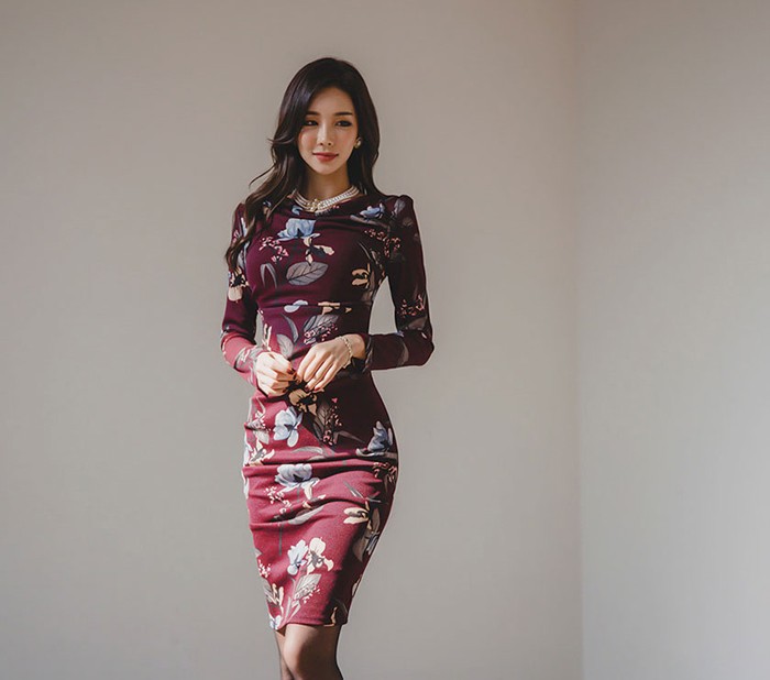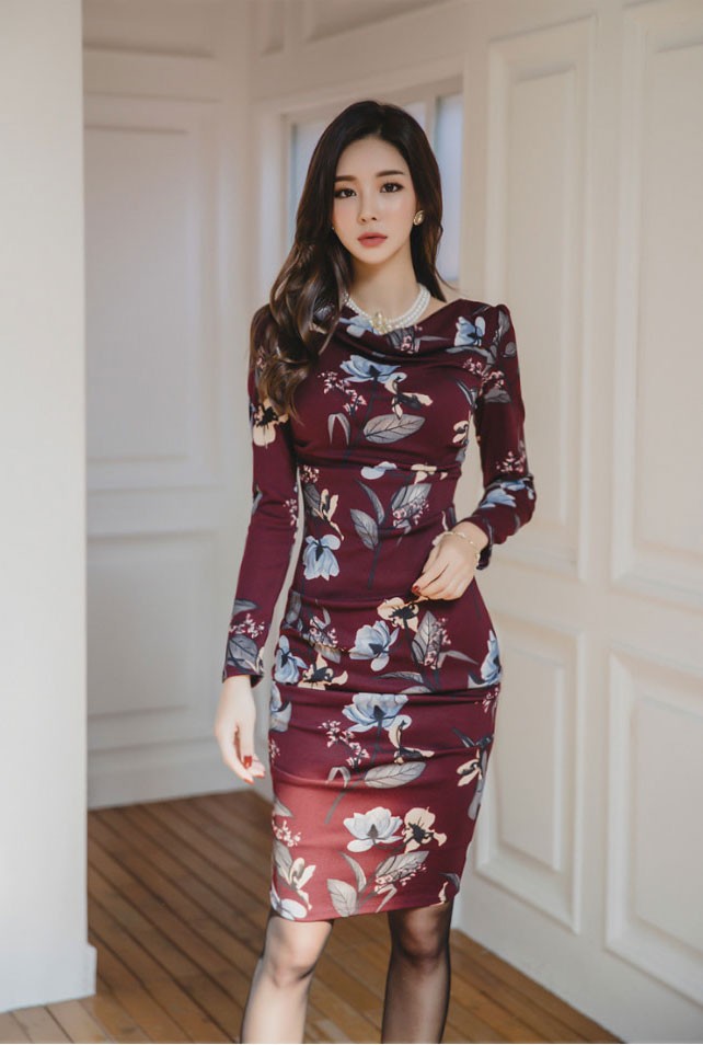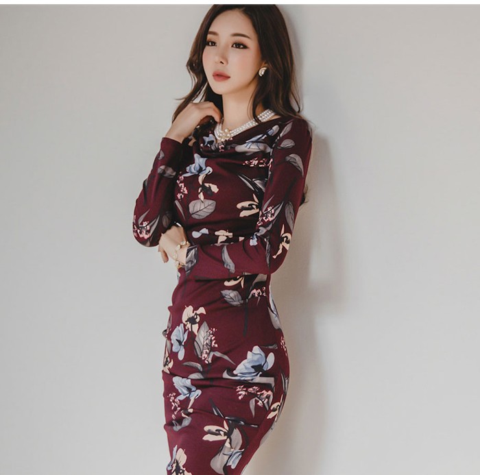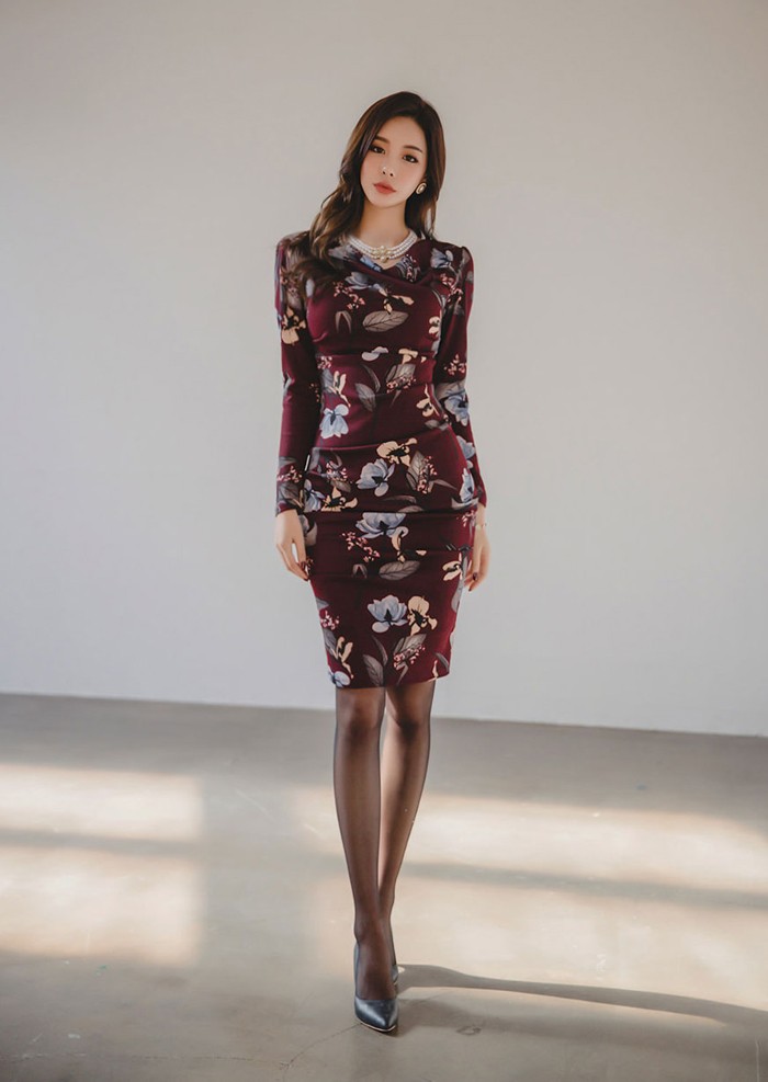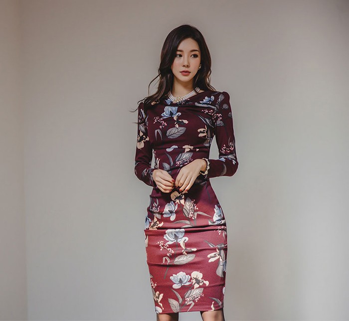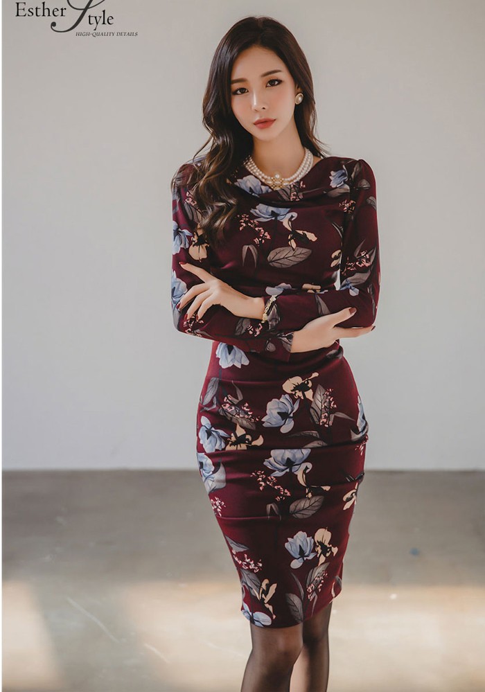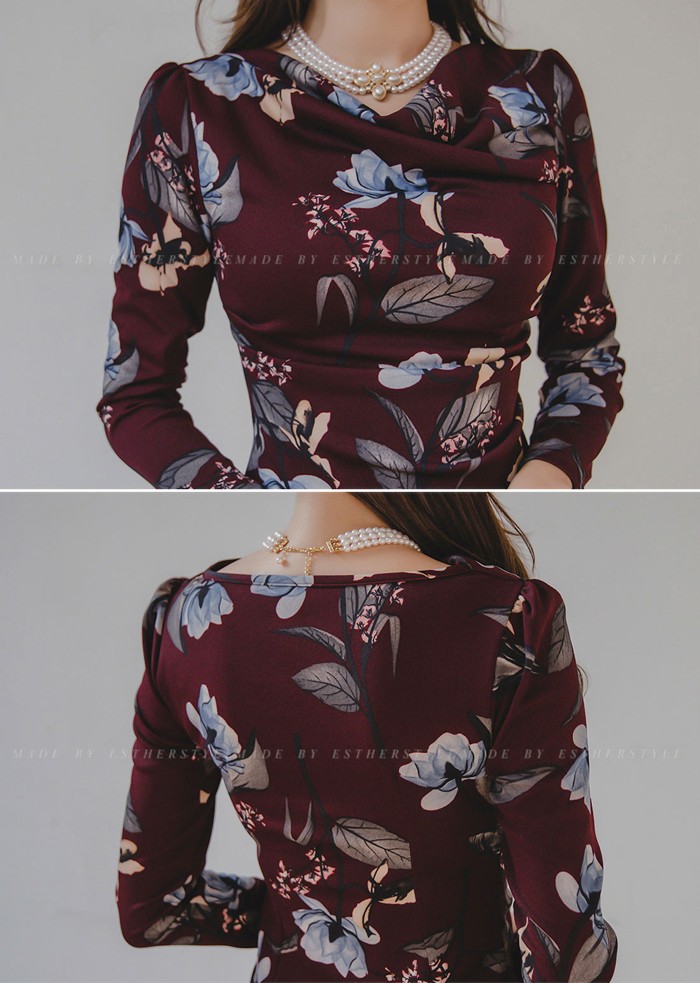 商品名:ワンピース タイトワンピース 膝丈 長袖 花柄 フラワー
